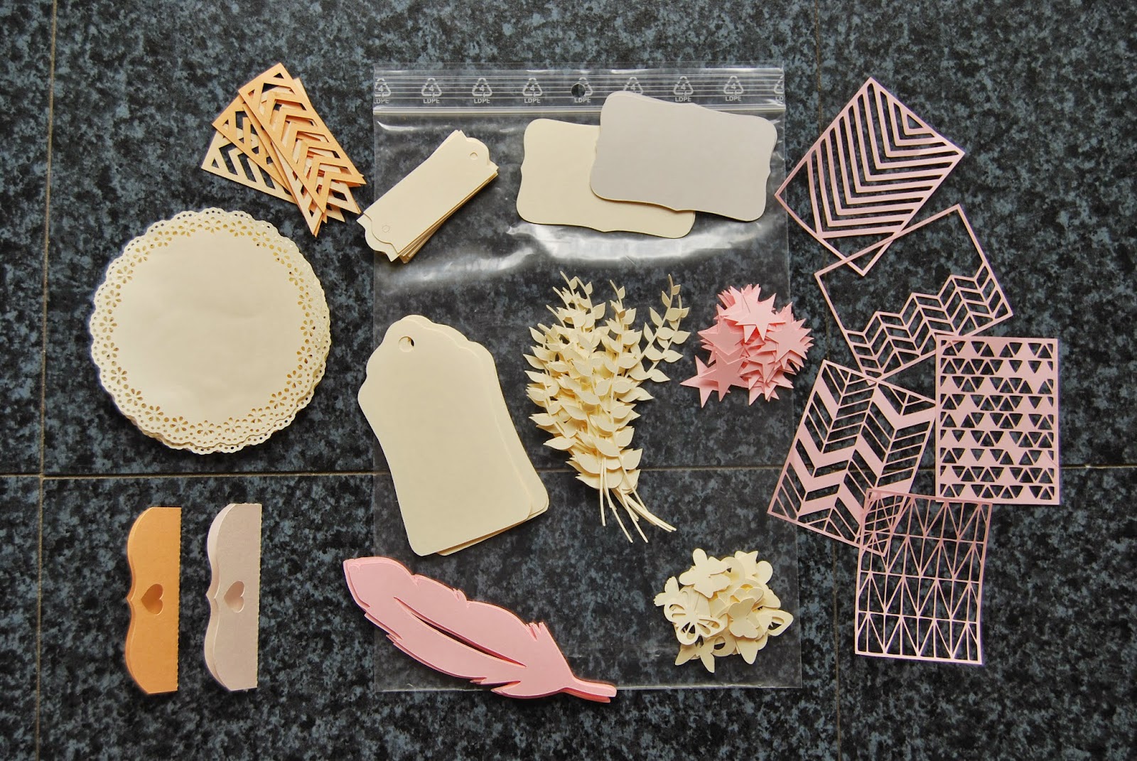 Pleins pleins de découpes faites avec des dies ou ma caméo contenue dans l’enveloppe rose !